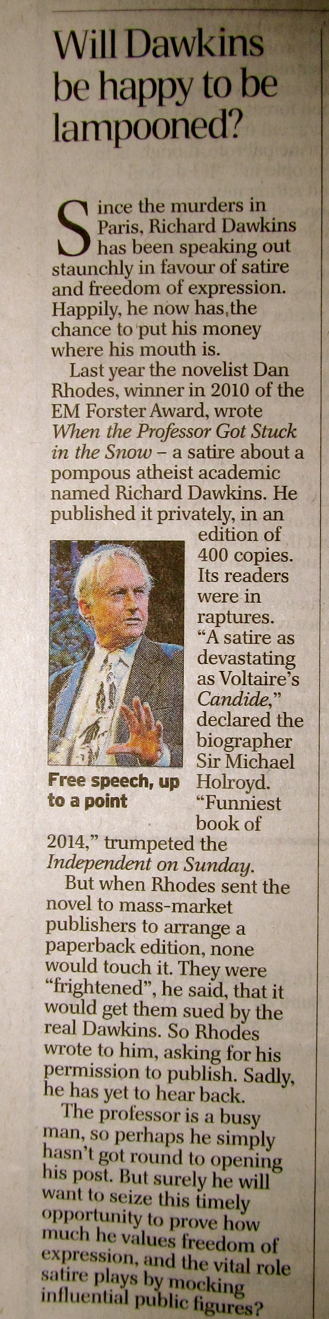 Most days I’m asked why my latest novel, When the Professor Got Stuck in the Snow, isn’t available. The sorry situation was neatly summarised by Michael Deacon in The Daily Telegraph on Saturday 17th January: